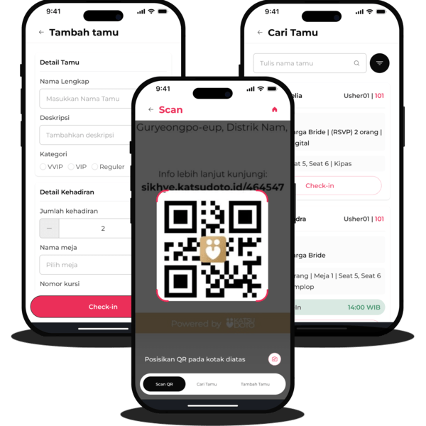 Permudah pencatatan kehadiran tamu di hari istimewa kamu dengan QR Check-in yang real-time, akurat, dan super aman! Bikin setiap kehadiran lebih spesial dengan fitur Selfie Check-in dan Auto Thank You Message!