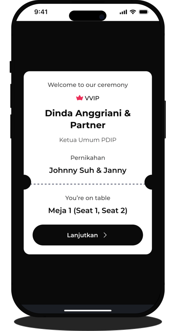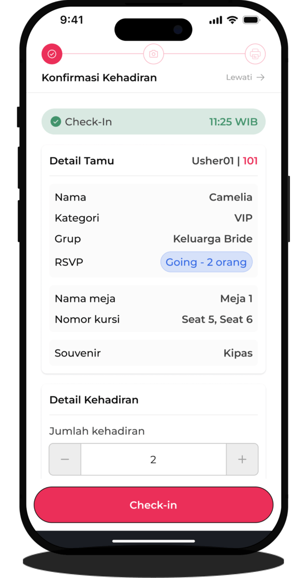 Setelah check-in, detail tamu akan diverifikasi oleh petugas (usher) untuk memastikan data check-in yang terperinci dan akurat. Fitur verifikasi bisa dinonaktifkan jika kamu menginginkannya.