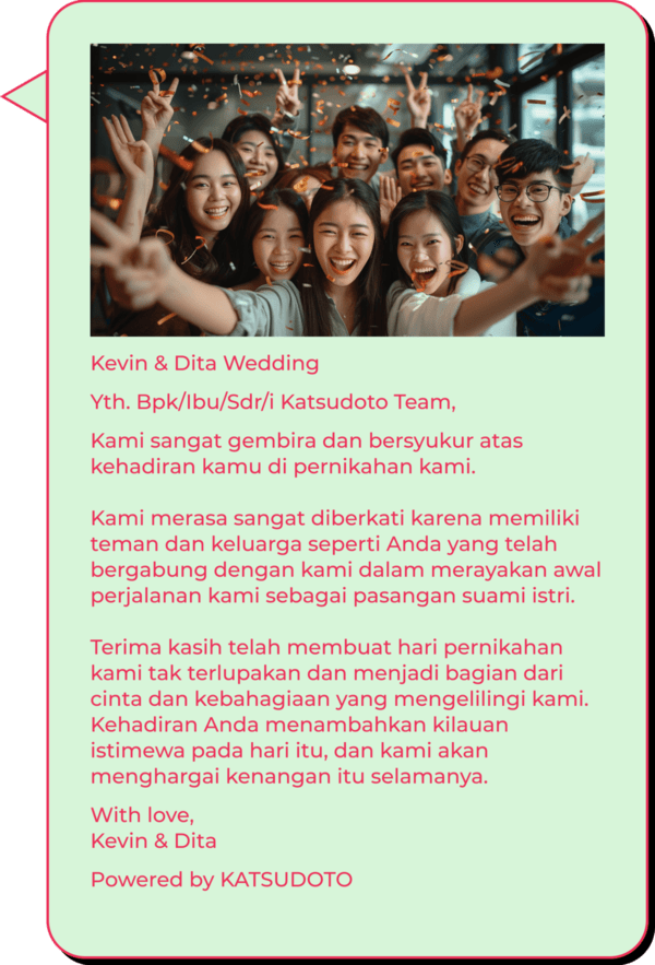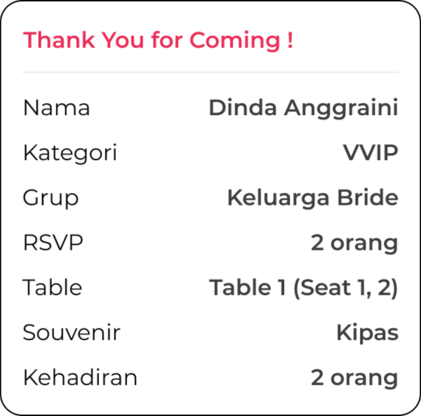 Setelah pesan undangan diterima, tamu kamu juga akan menerima E-invitation berisi ringkasan acara dan QR Code untuk bisa masuk ke acara.